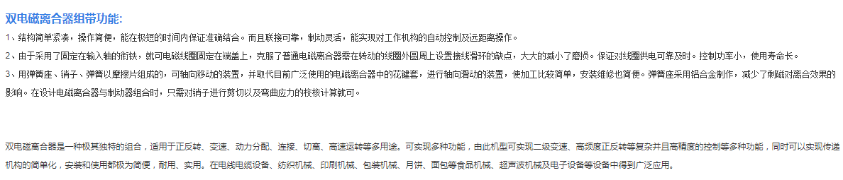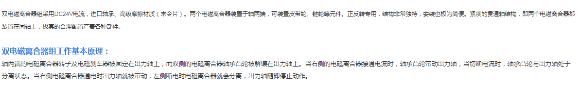 雙電磁離合器組采用DC24V電流,進口軸承、高級摩擦材質(來令片)。兩個電磁離合器裝置于軸兩端,可裝置皮帶輪、鏈輪等元件。正反轉專用,結構非常獨特,安裝也極為簡便。緊湊的貫通軸結構,即兩個電磁離合器都裝置在同軸上,極其的合理配置產著各種部件;
