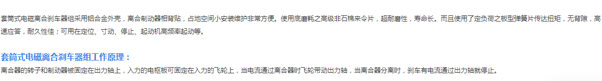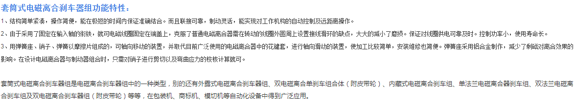 套筒式電磁離合剎車器組采用鋁合金外殼,離合制動器相背貼,占地空間小安裝維護非常方便。使用底磨耗之高級非石棉來令片,超耐磨性,壽命長。而且使用了定負荷之板型彈簧片傳達扭矩,無背隙,高速應答,耐久性佳;可用在定位、寸動、停止、起動機高頻率起動等。