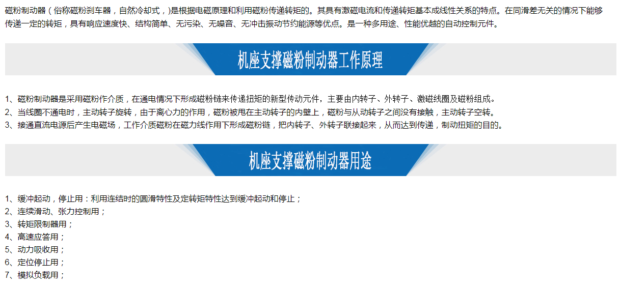 磁粉制動(dòng)器(俗稱磁粉剎車器,自然冷卻式,)是根據(jù)電磁原理和利用磁粉傳遞轉(zhuǎn)矩的。其具有激磁電流和傳遞轉(zhuǎn)矩基本成線性關(guān)系的特點(diǎn)。在同滑差無關(guān)的情況下能夠傳遞一定的轉(zhuǎn)矩,具有響應(yīng)速度快、結(jié)構(gòu)簡(jiǎn)單、無污染、無噪音、無沖擊振動(dòng)節(jié)約能源等優(yōu)點(diǎn)。是一種多用途、性能優(yōu)越的自動(dòng)控制元件。