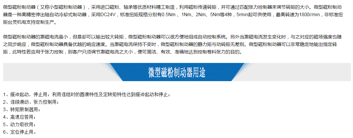 微型磁粉制動(dòng)器(又稱小型磁粉制動(dòng)器),采用進(jìn)口磁粉、軸承等優(yōu)質(zhì)材料精工制造,利用磁粉傳遞轉(zhuǎn)矩,并可通過(guò)匹配張力控制器來(lái)調(diào)節(jié)轉(zhuǎn)矩的大小。微型磁粉制動(dòng)器是一種高精密伸出軸自動(dòng)冷卻式制動(dòng)器,采用DC24V,標(biāo)準(zhǔn)扭矩規(guī)格分別有0.5Nm 、1Nm、2Nm、5Nm等4種,5rmin起可供使用,最高轉(zhuǎn)速為1800r/min,非標(biāo)準(zhǔn)扭矩臺(tái)靈機(jī)電支持定制生產(chǎn)。