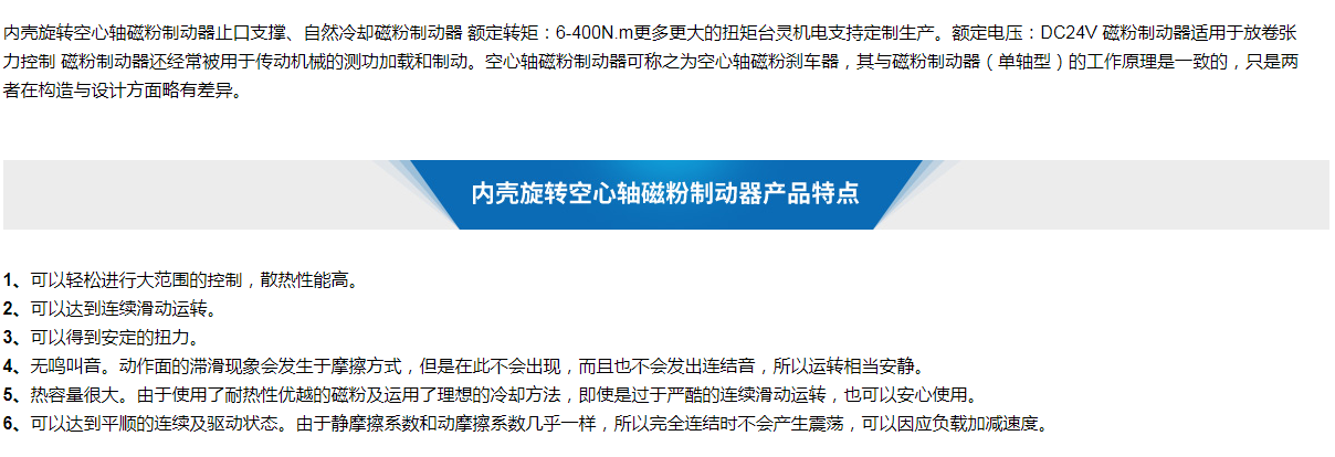 內(nèi)殼旋轉(zhuǎn)空心軸磁粉制動(dòng)器止口支撐、自然冷卻磁粉制動(dòng)器 額定轉(zhuǎn)矩:6-400N.m更多更大的扭矩臺(tái)靈機(jī)電支持定制生產(chǎn)。額定電壓:DC24V 磁粉制動(dòng)器適用于放卷張力控制 磁粉制動(dòng)器還經(jīng)常被用于傳動(dòng)機(jī)械的測(cè)功加載和制動(dòng)。