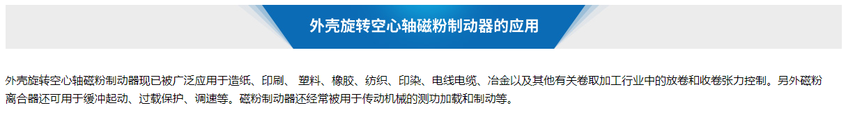 外殼旋轉空心軸磁粉制動器采用進口軸承、磁粉,環保無噪音,運轉相當的安靜平穩、采用耐熱性高的進口磁粉,使用壽命長,并且熱容量比較大;散熱方式為自然冷卻式,空心軸聯結、止口支撐,外殼旋轉,旋轉外圍以提高散熱性能,提高了熱容量的機型,5r/min起可供使用。主要扭矩有主要有6nm、12nm、25nm、50nm、100nm、200nm、400nm等。更多更大的扭矩天機支持定制生產。