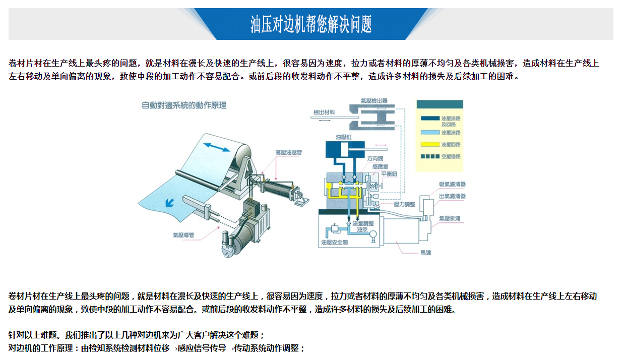 油壓式對邊機:可分為自動、手動、中心回位及全自動型。金牌對邊機為真正無接觸,無接點之動力系統,采用空油壓聯線系統制御,以空壓對流感應方式檢查材料邊緣在檢出口所造成的差壓比例,把訊號傳達至感應室內部,由感應室接收氣源系統判斷差壓比例之正負值,決定左右出油口的出油速度及數量。