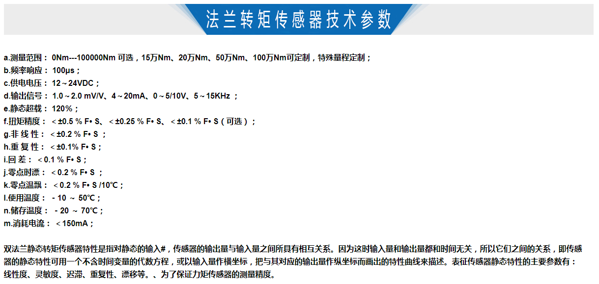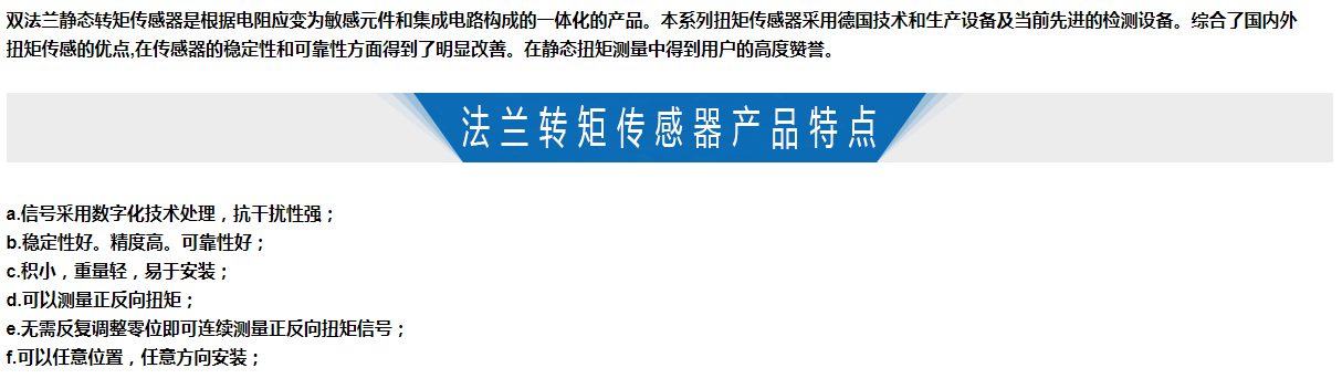 雙法蘭靜態轉矩傳感器是根據電阻應變為敏感元件和集成電路構成的一體化的產品。本系列扭矩傳感器采用德國技術和生產設備及當前先進的檢測設備。綜合了國內外扭矩傳感的優點,在傳感器的穩定性和可靠性方面得到了明顯改善。在靜態扭矩測量中得到用戶的高度贊譽。